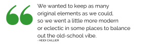 The entryway decor—a bench upholstered in a mud cloth pattern, an antique Oriental rug, and a whopper of a chandelier—shows another side of Heidi’s balancing skills: pairing clean lines and neutral colors with global patterns and a mix of new and vintage furniture. “It’s all about contrast,” Heidi says. “We wanted to keep as many original elements as we could, so we went a little more modern or eclectic in some places to balance out the old-school vibe.”