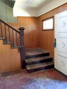 Beyond Heidi’s aesthetic issues with the dark-paneled living room, the space lacked useful storage. So Heidi had simple display shelves built on either side of a modern fireplace surround (a cost-effective solution for updating the old wood and brick model). The sleek design keeps the focus on the original leaded-glass windows.