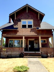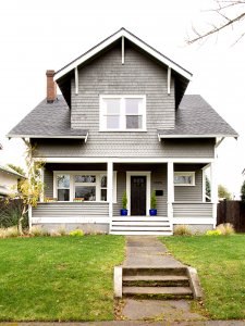 After shoring up the porch, they integrated the sections of shingle and lap siding with an allover gray paint job in Benjamin Moore Chelsea Gray HC-168. White trim accentuates architectural elements, and the door, mailbox, and house numbers match in all black.
