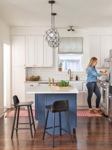 With family dinners and their supper club gatherings in mind, Heidi and Justin rethought the cramped kitchen. Pulling down the wall separating it from the dining room allowed space for an island, and adding extra cabinets increased storage. Shaker-style doors nod to the home’s age, but Heidi updated the style with accents like brass hardware and Moorish-inspired lights.