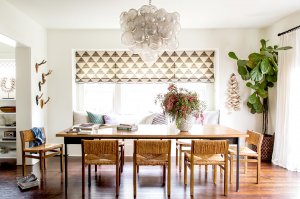 Removing some walls made room for a long table, site of the supper club parties the Cailliers host for friends. Bold elements like the graphic Roman shade and smoked glass chandelier are conversation starters, and the new built-in window seat creates a cozy alcove in the open space.