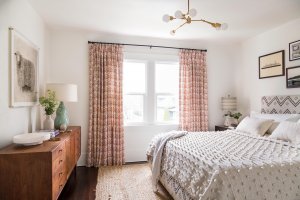 Heidi’s pattern-mixing strategy starts, she says, “by picking a few safe options that feel more muted. Then I layer on colorful pattern or something vintage.” In the master bedroom, a simple jute rug balances the bold upholstery on the bed, the pom-pom coverlet, and delicate print of the curtains.