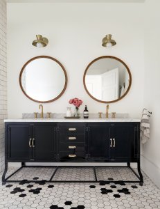 Heidi didn’t want any room to feel too modern, so she mixed old-school elements in the bathroom, like the hexagon tile floors and a vintage-style vanity, with updated accents like the hardware, lights, and round mirrors.